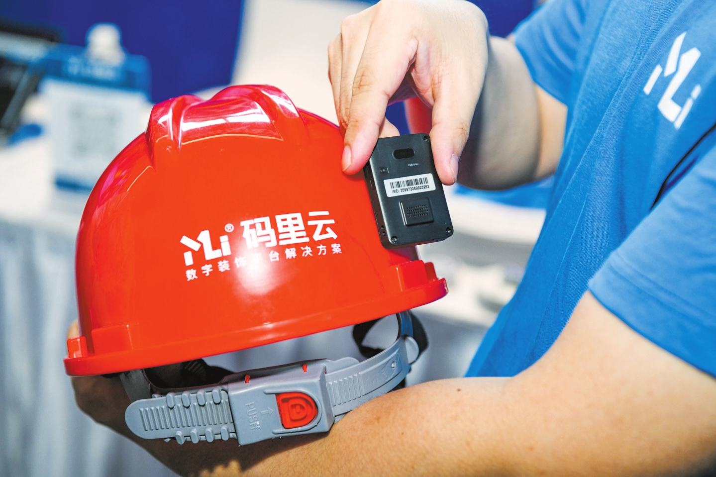 6月26日,中建三局裝飾智慧工地現場觀摩會上展示的智慧安全帽。