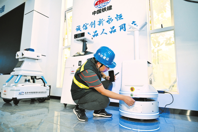 6月26日,中建三局裝飾智慧工地現場觀摩會智能建造展區,工作人員在操作演示智能劃線機器人。