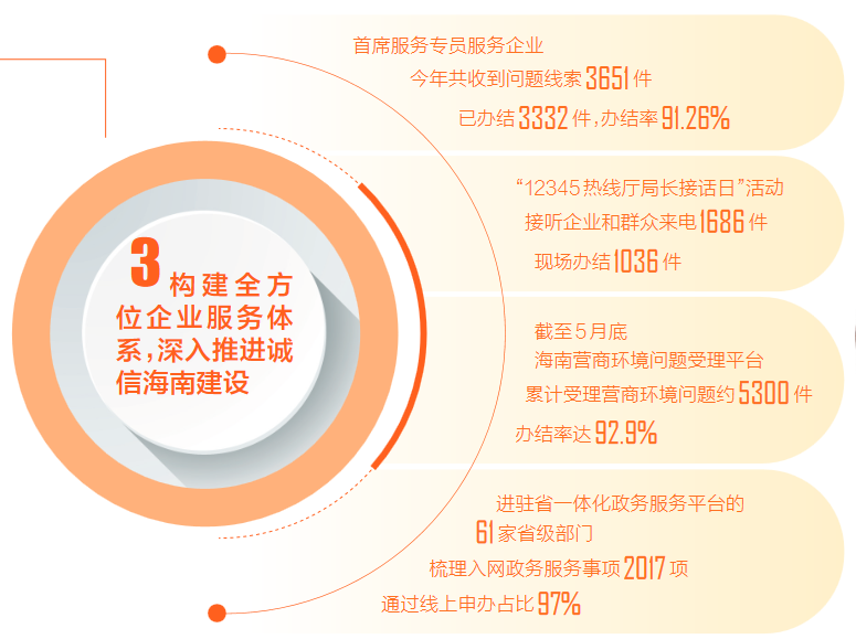 “誠”意濃。還清政府欠賬、盤活閑置土地,化解不動產登記歷史遺留難題……以經營主體的獲得感為準繩,海南策劃開展服務聯系經營主體系列活動,加大遺留問題核查處置力度,逐步構建起全方位企業服務體系。截至5月底,海南營商環境問題受理平臺累計受理營商環境問題約5340件,辦結率達92.02%。