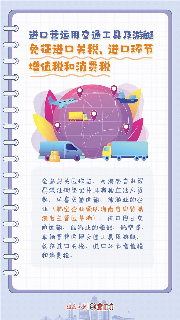 全島封關(guān)運作前,對海南自由貿(mào)易港注冊登記并具有獨立法人資格,從事交通運輸、旅游業(yè)的企業(yè)(航空企業(yè)須以海南自由貿(mào)易港為主營運基地),進(jìn)口用于交通運輸、旅游業(yè)的船舶、航空器、車輛等營運用交通工具及游艇,免征進(jìn)口關(guān)稅、進(jìn)口環(huán)節(jié)增值稅和消費稅。