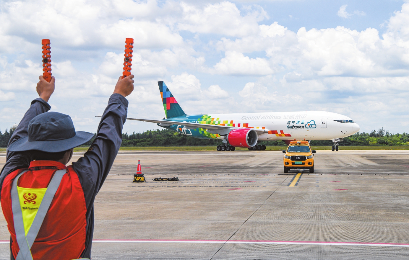一架波音777-200LRF型貨運(yùn)飛機(jī)降落在海口美蘭國(guó)際機(jī)場(chǎng),在海口海關(guān)所屬海口美蘭機(jī)場(chǎng)海關(guān)通關(guān)放行。海口日?qǐng)?bào)記者 蘇弼坤 攝