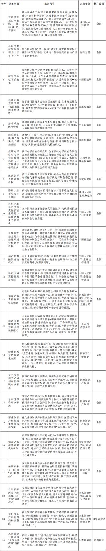 3.金融開放創新領域:“跨境人民幣全程電子繳稅”、“對外承包工程類優質誠信企業跨境人民幣結算業務便利化”、“證券、期貨、基金境外金融職業資格認可機制”、“動產質押融資業務模式”、“科創企業票據融資新模式”、“知識產權質押融資模式創新”等6項。